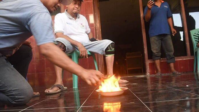 Air sumur yang berada di rumah Sulastri diduga tercermar, karena airnya berwarna hitam pekat dan ketika disulut api langsung terbakar.