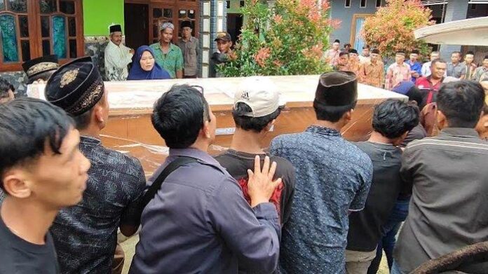 Hujan tangis dari saudara dan tetangga pecah saat peti jenazah dipikul dari ambulan menuju rumah duka.