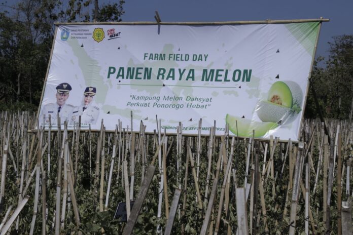 Bupati Ponorogo Sugiri Sancoko bersama Wakil Bupati Lisdyarita ikut dalam panen raya melon di Desa Grogol, Selasa (26/9/2023). Para petani sengaja memilih bibit varietas Pertiwi untuk menjamin kuantitas dan kualitas hasil panen.