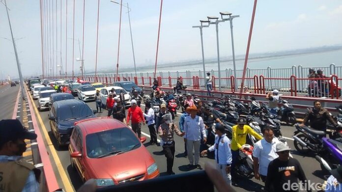 Surabaya – Ratusan pedemo yang tergabung dalam organisasi masyarakat Madura Asli (Madas) mulai beraksi di Jembatan Suramadu jalur Surabaya arah Bangkalan. Mereka berjalan kaki bergerombol membentangkan spanduk menutup satu lajur mobil di bagian tengah jembatan.