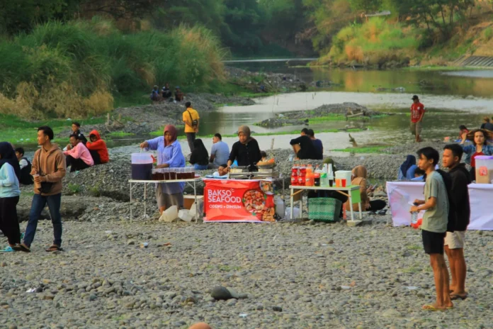 Kondisi itu lantas dimanfaatkan sejumlah pedagang kaki lima alias PKL dadakan untuk mengais rezeki. Mereka menjajakan dagangannya hingga di tengah sungai yang mengering itu. Ada puluhan PKL yang menggelar lapaknya di lokasi tersebut.
