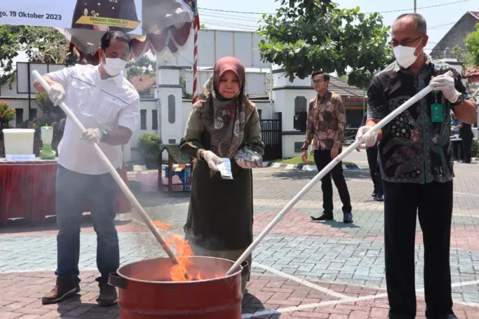 Ponorogo – Ribuan obat-obatan terlarang dimusnahkan Kejaksaan Negeri (Kejari Ponorogo) kemarin (19/10). Mulai sabu-sabu, hingga pil double L diblender layaknya jus. Pemusnahan barang (BB) dilakukan setelah memiliki kekuatan hukum tetap alias inkrah.