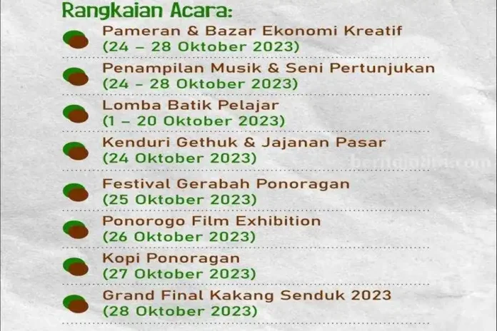 Lebih lanjut, pada tanggal 26 Oktober 2023 nanti, Ponorogo akan menjadi tuan rumah Ponorogo Film Exhibition. Acara ini akan menampilkan dua sesi dan hiburan musik rock dan akustik. Bagi pecinta kopi, tanggal 27 Oktober akan menjadi hari yang sangat dinantikan. Yakni acara Kopi Ponoragan Part 1 dan 2 akan memanjakan penikmat kopi, sambil menikmati musik jazz yang mengalun.