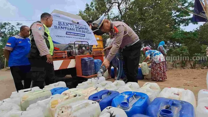 Mojokerto – Polres Mojokerto mendistribusikan air bersih untuk warga di Desa Kunjorowesi, Kecamatan Ngoro, Kabupaten Mojokerto. Menyusul musim kemarau panjang yang menyebabkan warga di desa paling timur Kabupaten Mojokerto ini kesulitan air bersih.