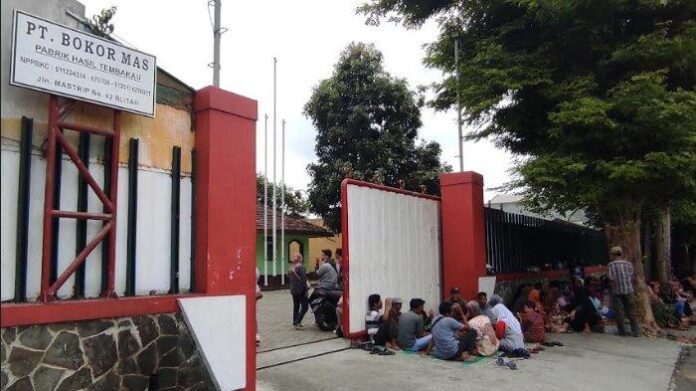 Blitar – Sejumlah buruh Pabrik Rokok Bokor Mas yang jadi Korban PHK menggelar aksi damai di depan kantor PT Bokor Mas, Jl Mastrip, Kota Blitar, Senin (6/11/2023).