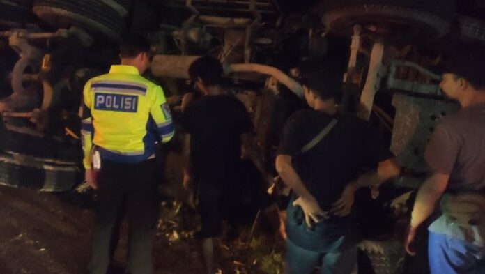Truk terguling dengan posisi roda sebelah kanan berada di atas hingga membentur pagar BRIN. Kecelakaan diduga karena kelalaian pengemudi truk molen.