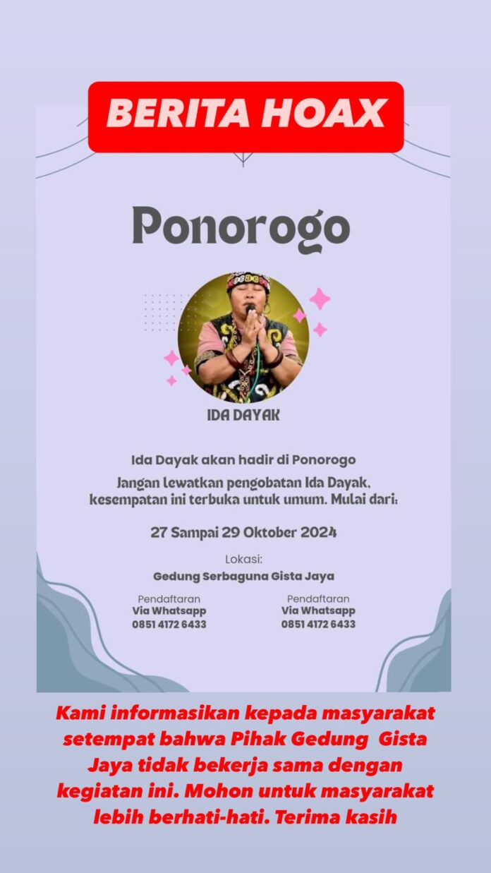 Ponorogo – Ramai menjadi perbincangan warganet di Ponorogo bawasanya Ida Dayak akan datang ke Ponorogo untuk melakukan pengobatan alternatif di Gedung Gista jaya pada tanggal 27 hingga 29 Oktober 2024.