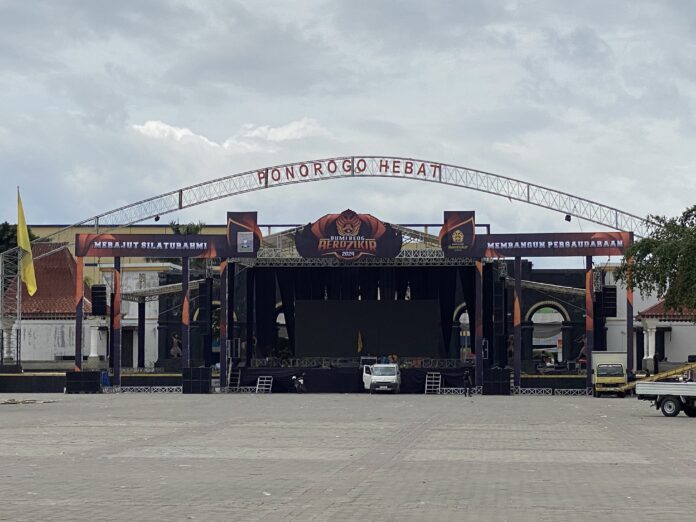 Pada Sabtu Siang (28/12), terlihat Panitia dan Pekerja sedang mempersiapkan panggung utama di Alun-alun Ponorogo, Sound System dan juga perlengkapan lainnya sudah mulai dipasang.