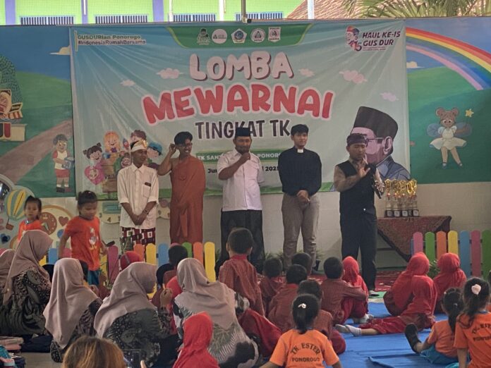 Ponorogo – Dalam rangka memeriahkan Haul Gus Dur ke-15, Komunitas GUSDURian Kabupaten Ponorogo bersama mitra komunitas menggelar lomba mewarnai sketsa Gus Dur untuk anak anak tingkat TK/PAUD.
