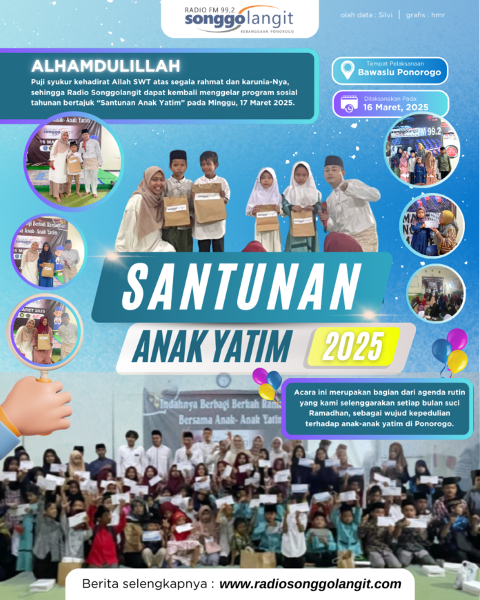 Ponorogo – Alhamdulillah, puji syukur kehadirat Allah SWT atas segala rahmat dan karunia-Nya, Radio Songgolangit kembali sukses menyelenggarakan program sosial tahunan bertajuk “Santunan Anak Yatim” pada Minggu, 16 Maret 2025. Acara ini merupakan bagian dari agenda rutin yang diadakan setiap bulan suci Ramadhan, sebagai bentuk kepedulian terhadap anak-anak yatim di Ponorogo.