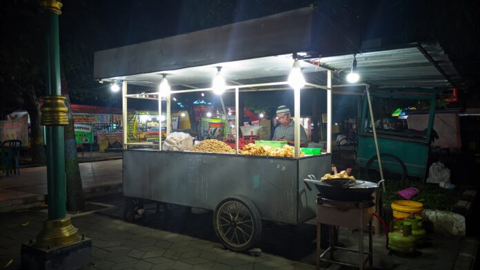 Ponorogo – Hujan gerimis yang sering mengguyur kawasan Alun-Alun Ponorogo belakangan ini membuat para pedagang pasar malam menghadapi tantangan. Salah satunya adalah Mujiono (60), pedagang kacang dan gorengan, yang mengaku omsetnya turun drastis karena cuaca yang kurang mendukung.