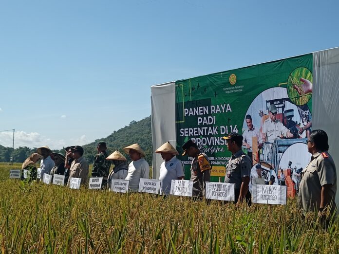 Ponorogo – Bupati Sugiri Sancoko, memimpin langsung panen raya padi di Desa Crabak, Ngrandu, Kecamatan Kauman, pada Senin (7/4/2025). Kegiatan ini merupakan bagian dari panen serentak di 14 provinsi sentra padi utama di Indonesia.
