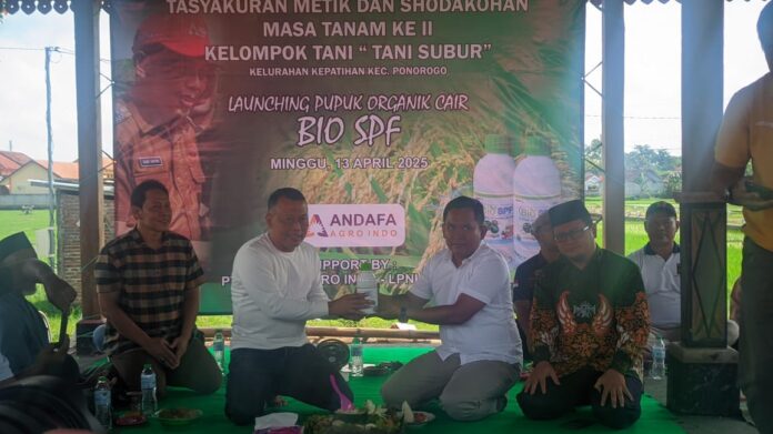 Ponorogo – Kelompok Tani “Tani Subur” Kelurahan Kepatihan, Kecamatan Ponorogo, menggelar acara Tasyakuran Metik dan Shodakohan Masa Tanam Kedua sekaligus Launching Pupuk Organik Cair (POC) BIO SPF pada Minggu (13/4/2025). Acara ini menjadi momentum penting dalam mendukung gerakan pertanian organik di Kabupaten Ponorogo.