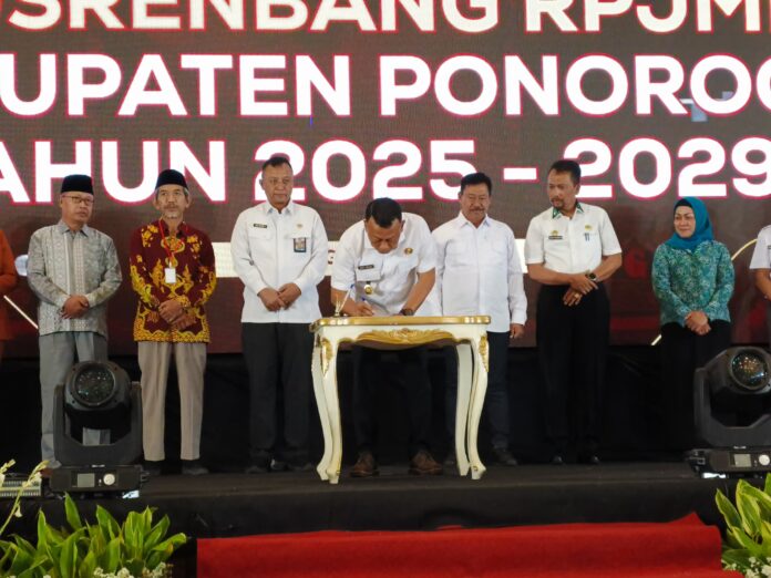 Ponorogo – Pemerintah Kabupaten (Pemkab) Ponorogo menyelenggarakan Musyawarah Perencanaan Pembangunan (Musrenbang) RPJMD 2025-2029 di Gedung Sasana Praja pada Rabu, (30/4/2025). Acara tersebut dihadiri oleh Bupati dan Wakil Bupati Ponorogo, Kepala Bakorwil Madiun Heru Wahono Santoso, Sekda Ponorogo Agus Pramono, pimpinan organisasi perangkat daerah (OPD) terkait, perwakilan ormas, rektor perguruan tinggi, serta jurnalis.