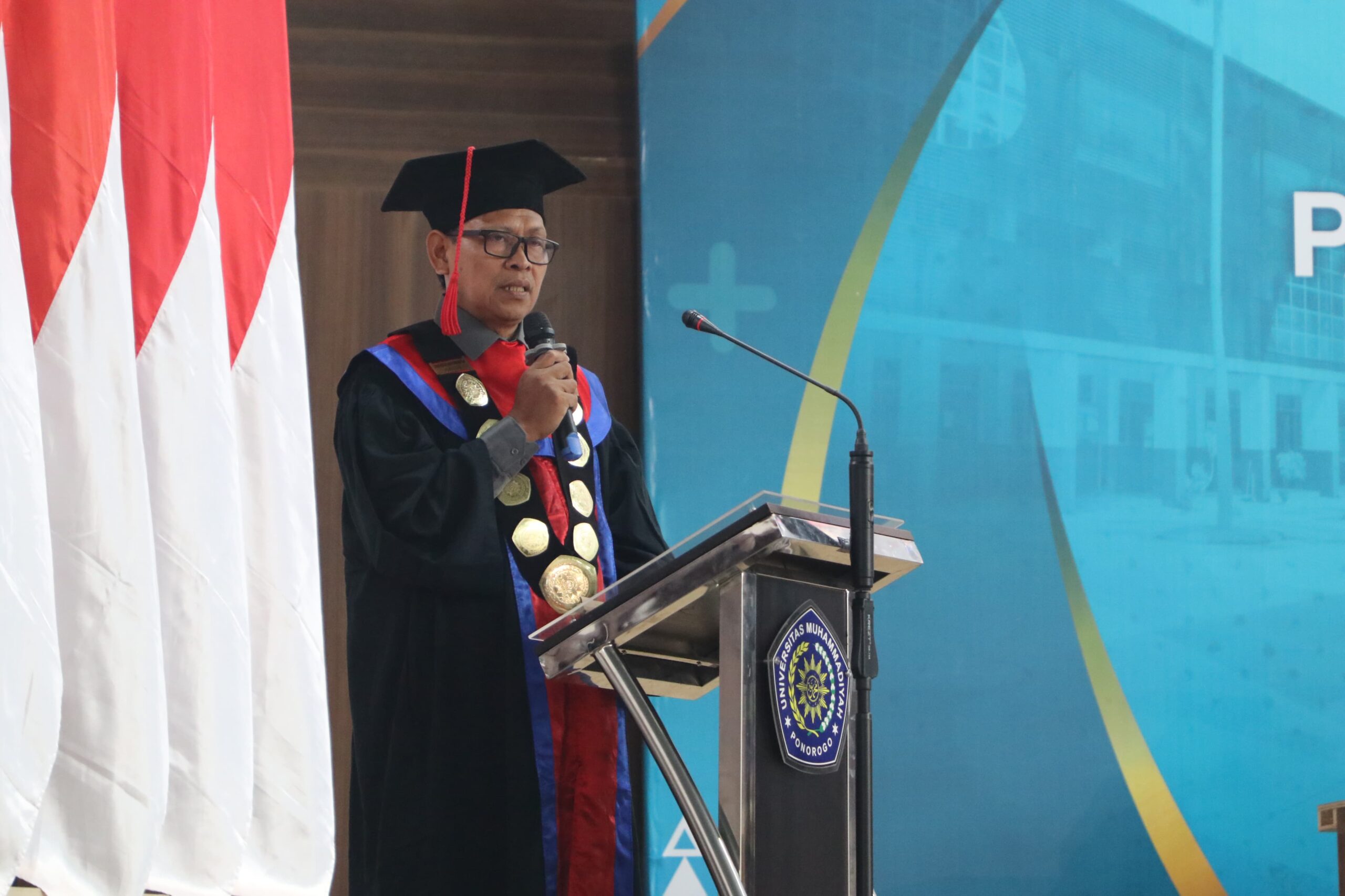 Dalam momen bahagia itu, Rektor Universitas Muhammadiyah Ponorogo, Dr. Rido Kurnianto menyampaikan ucapan selamat kepada seluruh wisudawan atas capaian studi mereka. Namun, ia juga mengingatkan bahwa wisuda bukanlah akhir dari perjalanan, melainkan awal dari tanggung jawab dan pengabdian kepada masyarakat.