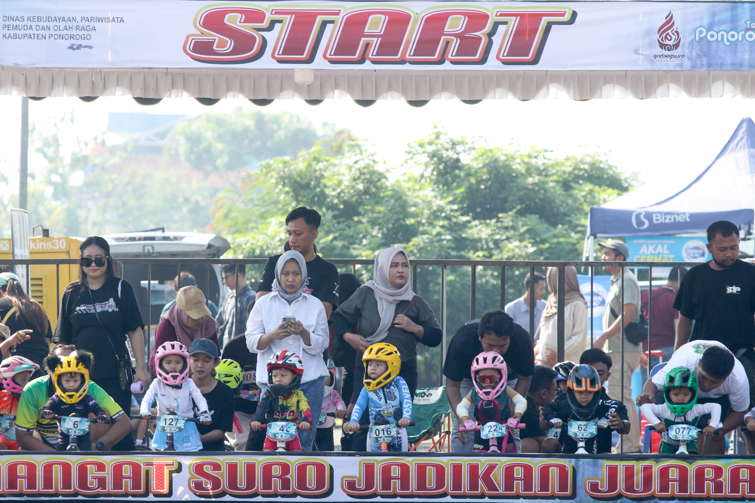 PONOROGO – Ratusan peserta dari berbagai wilayah di Indonesia turut serta dalam kompetisi sepeda tanpa pedal untuk anak-anak (push bike) bertajuk Portal Suro Open Race 2025 di Kabupaten Ponorogo. Acara yang diselenggarakan pada Sabtu (21/6/2025) ini menjadi salah satu daya tarik utama dalam serangkaian kegiatan Grebeg Suro 2025.