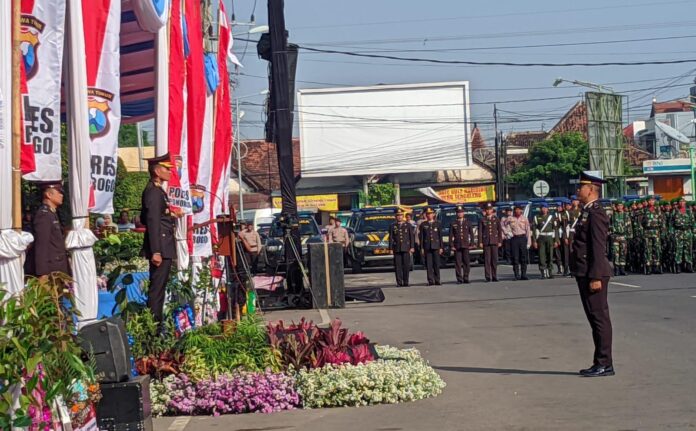 PONOROGO – Kepolisian Resor (Polres) Ponorogo menggelar upacara peringatan Hari Bhayangkara ke-79 di utara Alun-Alun Ponorogo pada Selasa (1/7/2025). Acara yang dihadiri oleh Ratusan peserta dari berbagai unsur hadir mengikuti upacara. Mulai dari personel Polri, TNI, pelajar, Kokam, Banser, hingga perwakilan dari Dishub, BPBD, instansi pemerintah, serta elemen masyarakat ini berlangsung khidmat dan penuh semangat kebersamaan.
