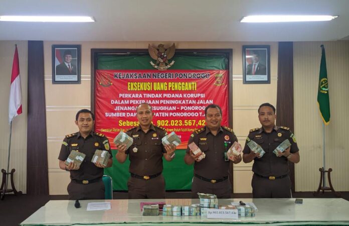 PONOROGO – Kejaksaan Negeri (Kejari) Ponorogo berhasil mengeksekusi pembayaran uang pengganti senilai lebih dari Rp902 juta terkait tindak pidana korupsi dalam proyek peningkatan jalan Jenangan-Kesugihan, Kecamatan Pulung. Terdakwa Ferdiansyah Himawan, yang saat ini menjalani hukuman pidana, telah melunasi kewajibannya tersebut.