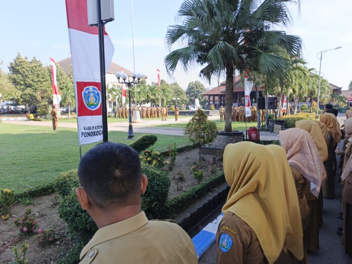 PONOROGO – Apel gabungan di Pendopo Kabupaten Ponorogo pada Senin (25/8/2025) diwarnai arahan khusus dari Bupati Ponorogo, Sugiri Sancoko. Dalam sambutannya, ia menegaskan agar penggunaan lagu Indonesia Raya dengan tiga stanza mulai diterapkan dalam acara-acara resmi yang tidak disertai pengibaran bendera.