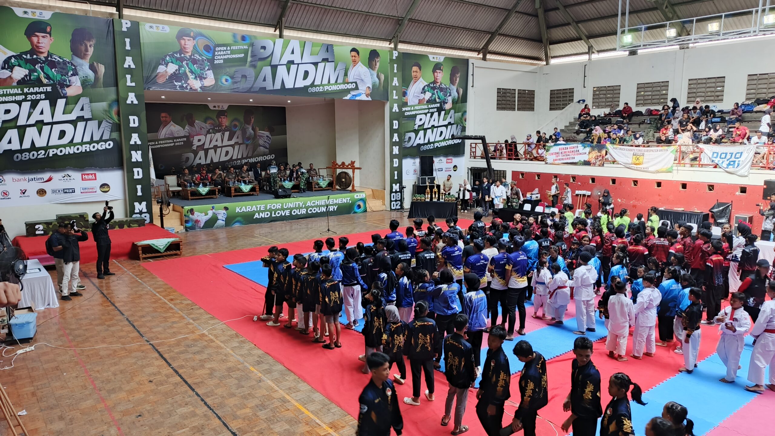 PONOROGO – Open & Festival Karate Championship Piala Dandim 0802/Ponorogo dalam rangka memperingati Hari Ulang Tahun (HUT) ke 80 Tentara Nasional Indonesia (TNI) Tahun 2025 hari ini resmi dibuka, di Gelanggang Olah Raga (GOR) Singodimedjo pada Sabtu (04/10/2025).